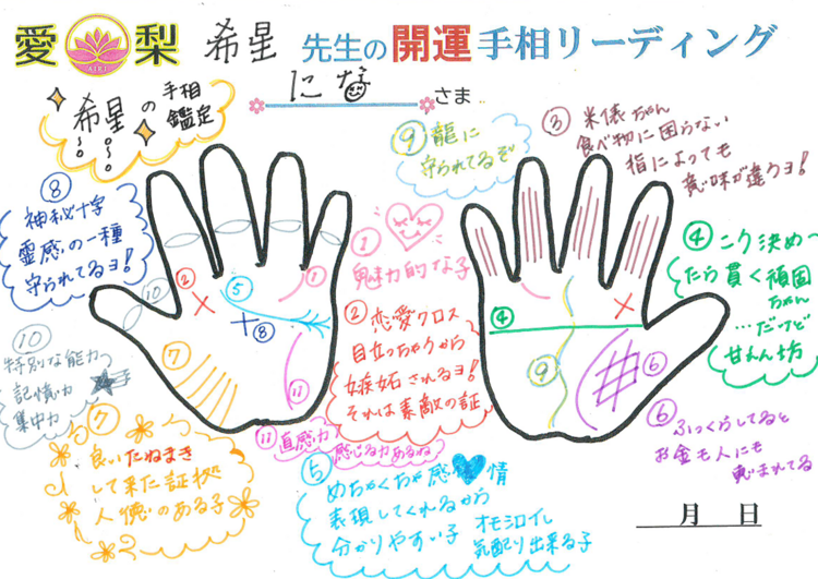 | …星に願い希望を持って《希星》と申します 幼少期。本の付録に付いてたカード占いがキッカケで1人占いをよ 何か有れば神様に話を聞いて頂き。不思議な知らせやピンチの時も 私は波乱万丈な人生を歩んで来たのは色々な経験をさせて頂き、そ 心の悩みや重荷を1人で抱えていませんか? あなたと一緒に、あなた自身が持つ心の力を引き出し笑顔になって 易占いは《新年度 来年度》運勢を鑑定いたします。【ネット予約のみお受け可能】 ![]() *イラスト付きの手相鑑定をご希望のお客様は、 ご予約時にショートコース20分鑑定ではなく、 【カラフル開運 手相鑑定】20分または30分鑑定の専用コースをご選択下さい。 尚、鑑定書なしの1100円の手相鑑定のご予約、ご指名は受付しておりません。 また、カラフル開運手相鑑定を含む、複数の占術を使う総合鑑定ご希望の場合、 40分のスタンダードコース以上のお申し込みが必要となります。 鑑定料金はこちらをクリック こちらの予約サイトにて、現在の予約状況が確認いただけます。 ご予約は予約サイトよりお願い致します。 |