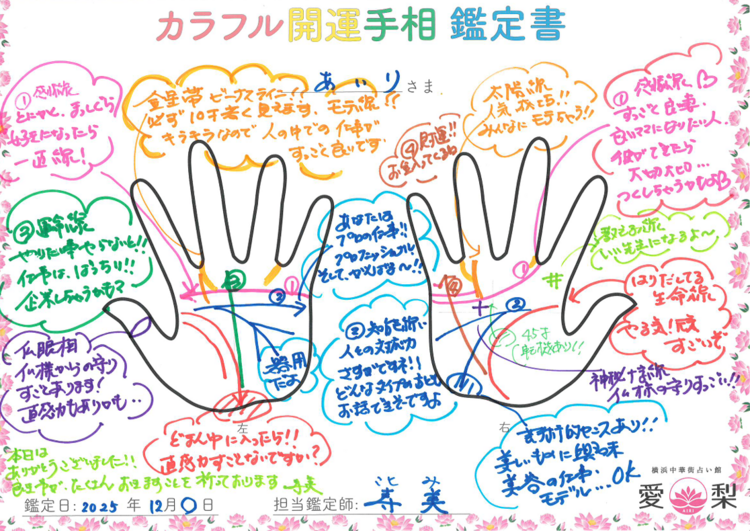 - タロット、数秘術、素質論(潜在意識,健在意識の発見,強みの発見)、聖明学(運命,お相手との相性,ビジネスコーチング)、相性、カラフル開運手相、手相