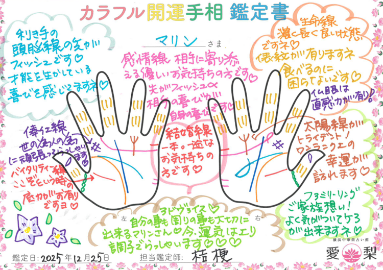 | あなたの内側に広がる宇宙 そこに本質のあなたがいます。 神聖な神としてのあなたは 本当の答えを知っているのです。 何も怖くありません。 愛と光に満ちた あなたの宇宙を探究し 答えを見つけるお手伝いを させて下さい。 ![]() *イラスト付きの手相鑑定をご希望のお客様は、 ご予約時にショートコース20分鑑定ではなく、 【カラフル開運 手相鑑定】20分または30分鑑定の専用コースをご選択下さい。 尚、鑑定書なしの1100円の手相鑑定のご予約、ご指名は受付しておりません。 また、カラフル開運手相鑑定を含む、複数の占術を使う総合鑑定ご希望の場合、 40分のスタンダードコース以上のお申し込みが必要となります。 鑑定料金はこちらをクリック こちらの予約サイトにて、現在の予約状況が確認いただけます。 ご予約は予約サイトよりお願い致します。 |