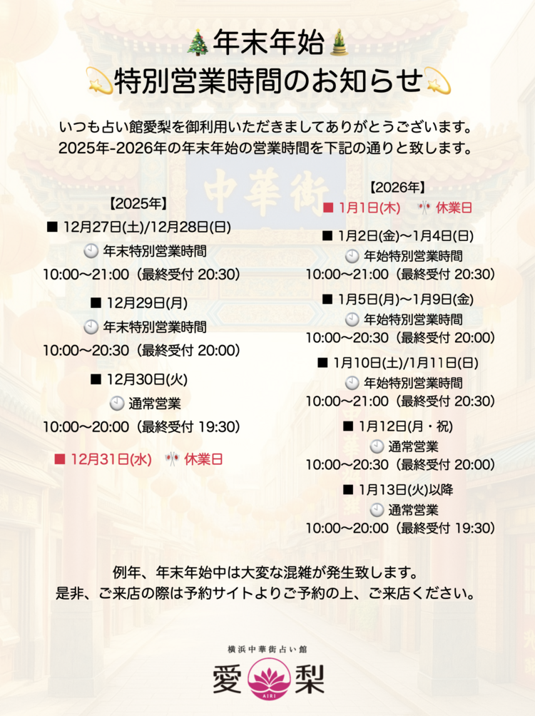 2025年、2026年の年末年始の営業時間を下記の通りと致します✅